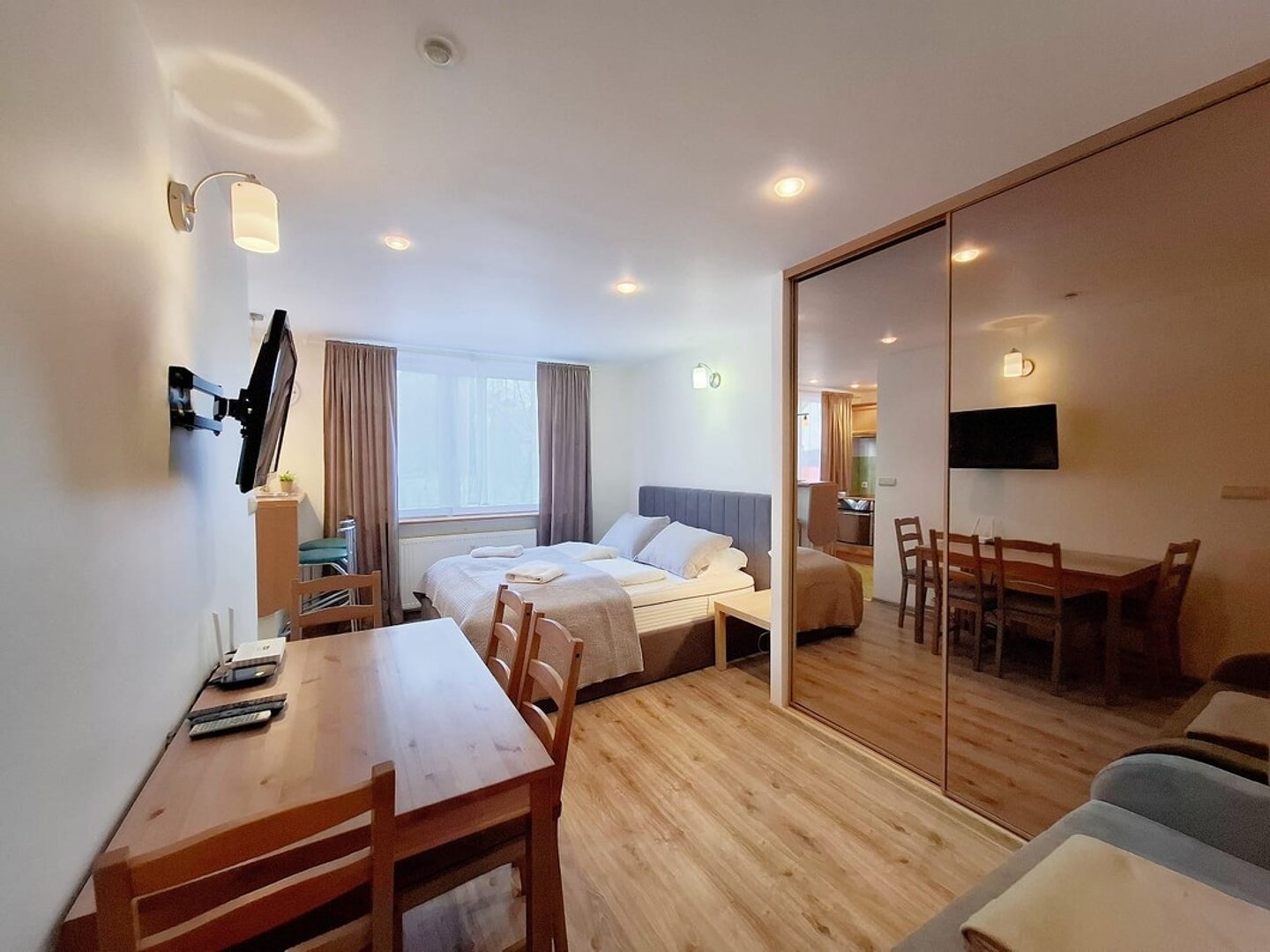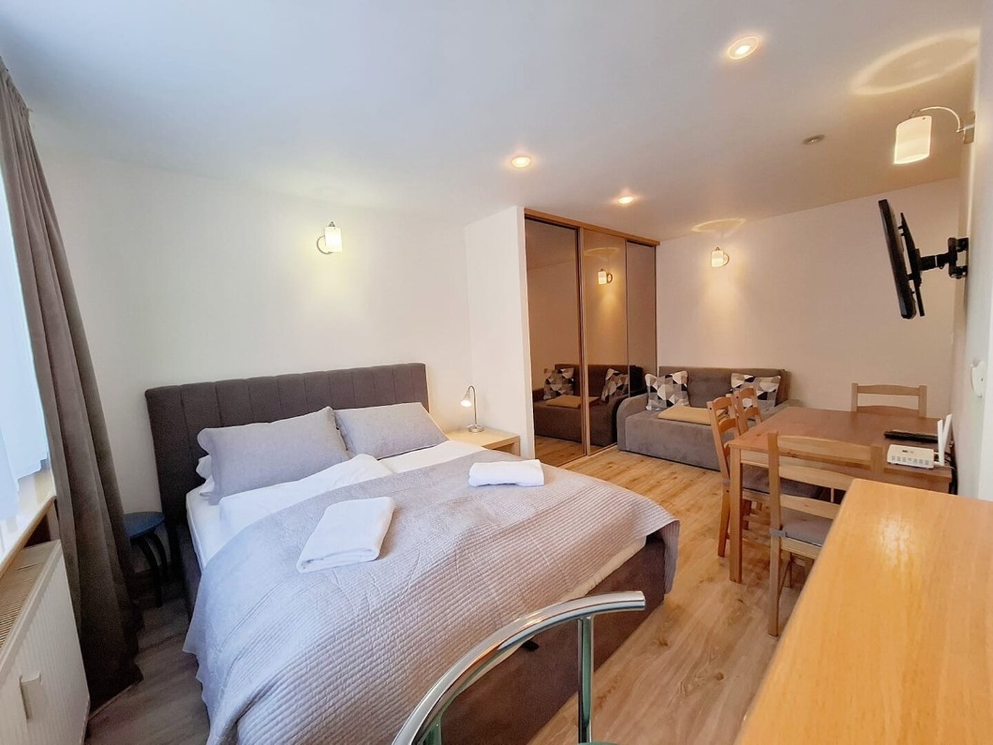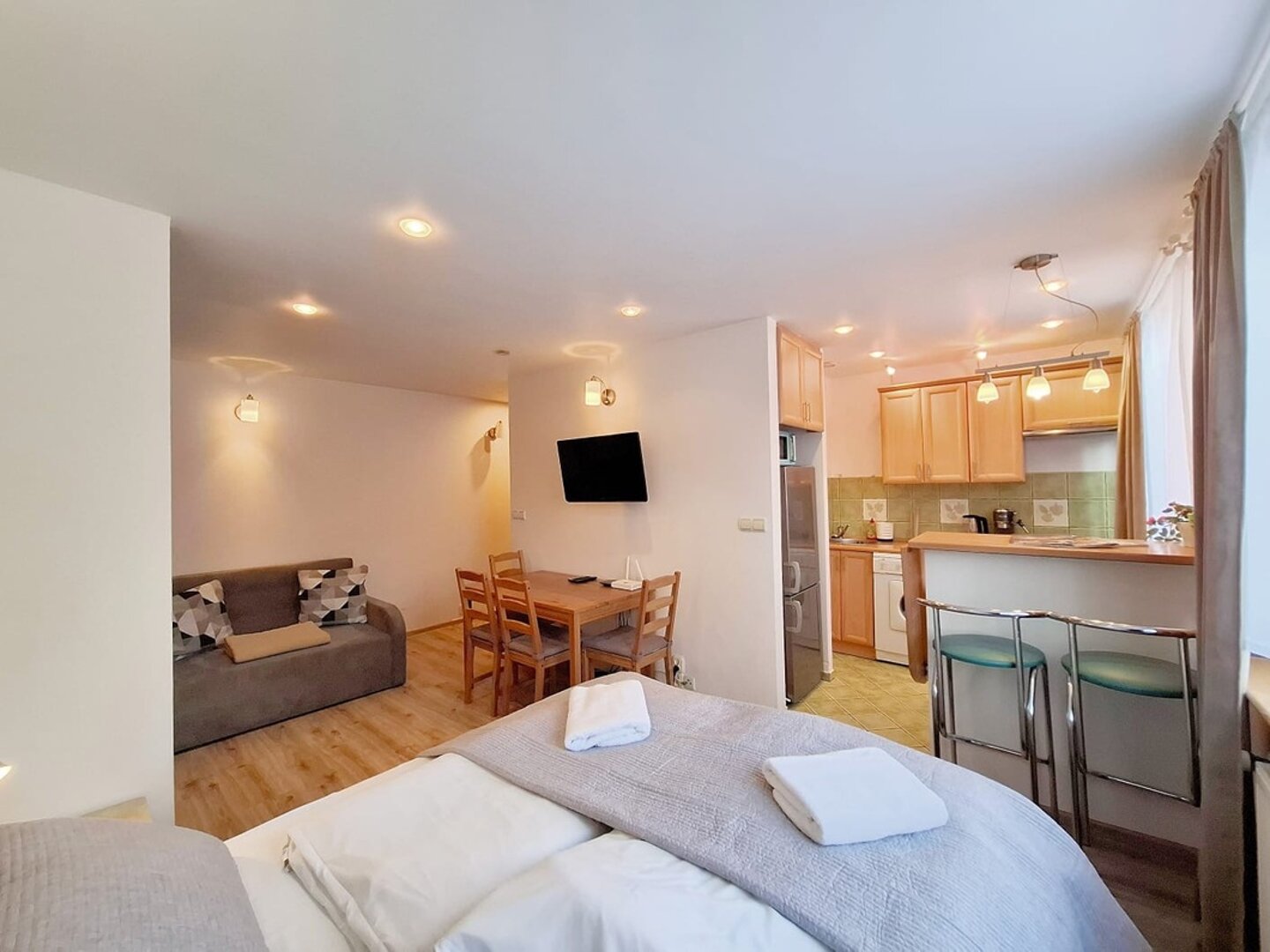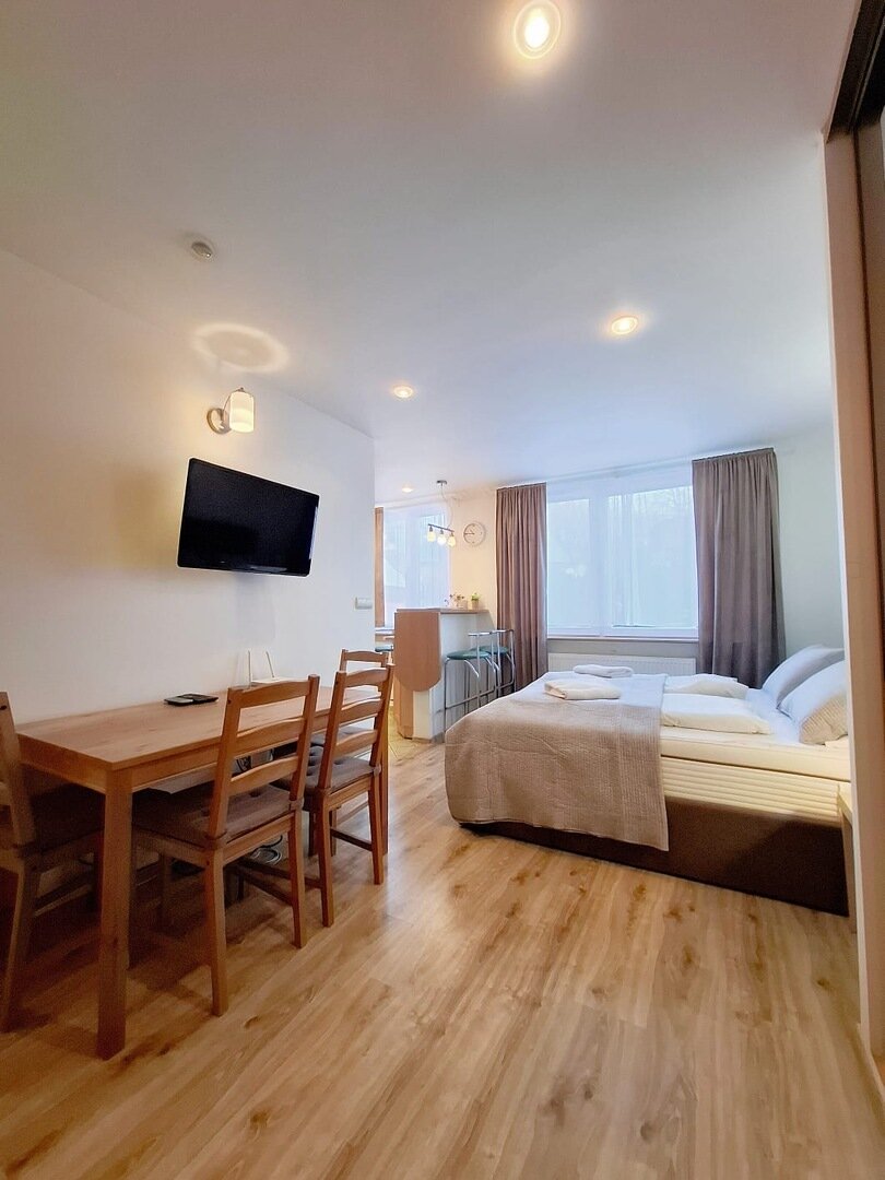 Cozy apartment for 4 people, STUDIO type, spacious living room and separate bedroom with comfortable bed. The apartment has a fully equipped kitchen and modern bathroom providing full comfort.
