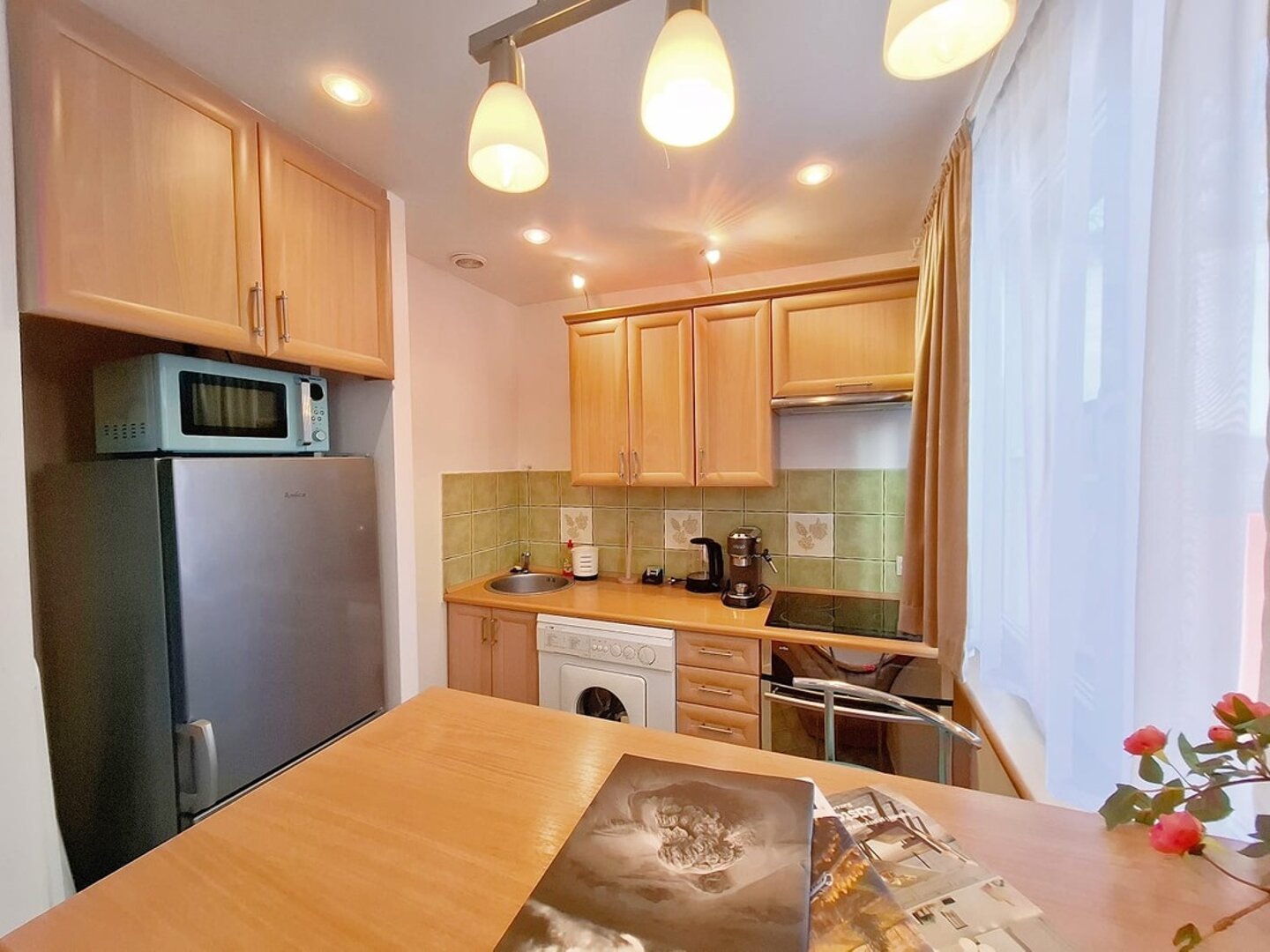 Spacious apartment with a private sauna and a balcony, located in a newly constructed building, perfect for a comfortable stay. The apartment can comfortably accommodate up to 4 guests. Guests have access to a fully equipped kitchenette with a dining area