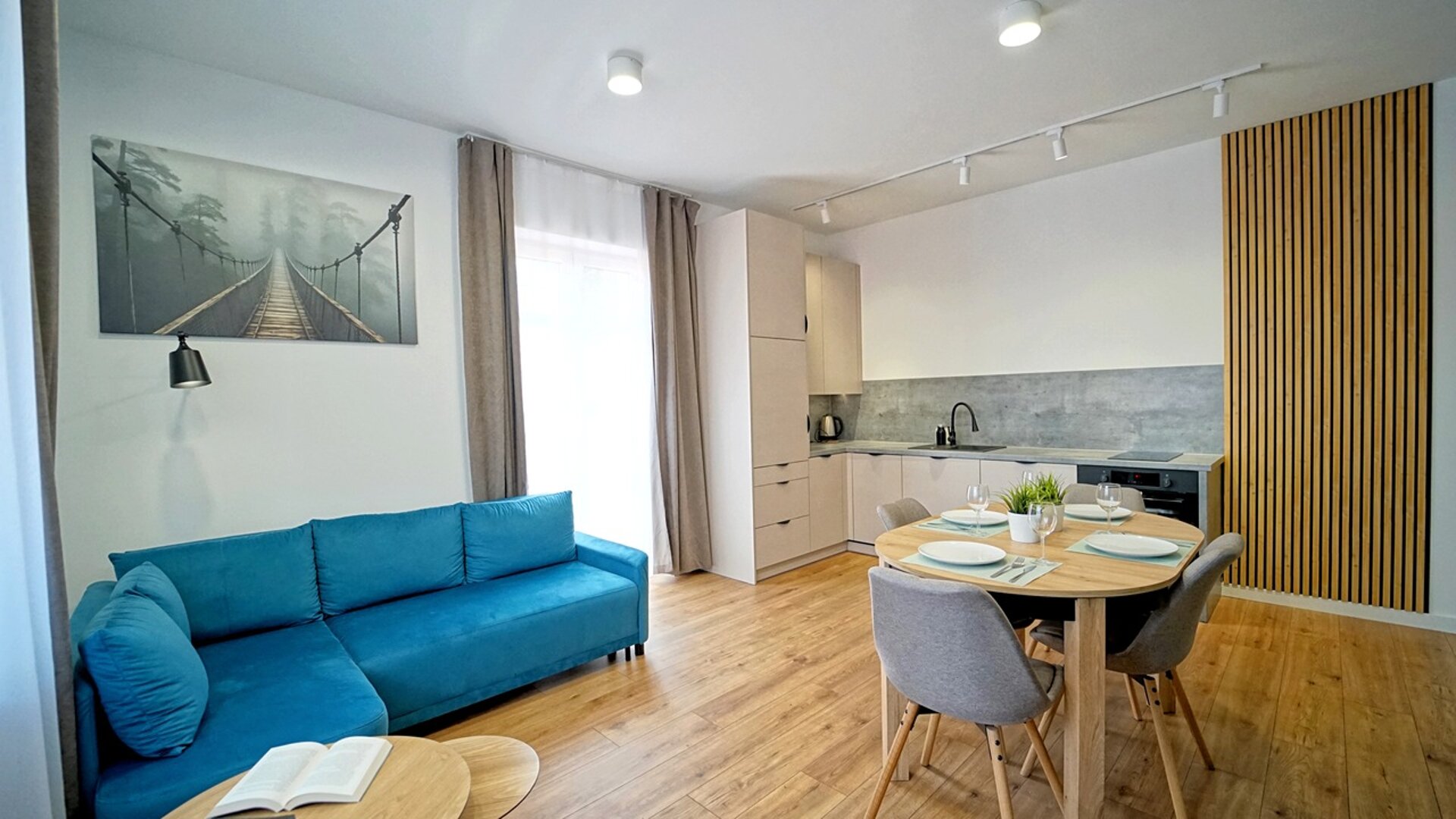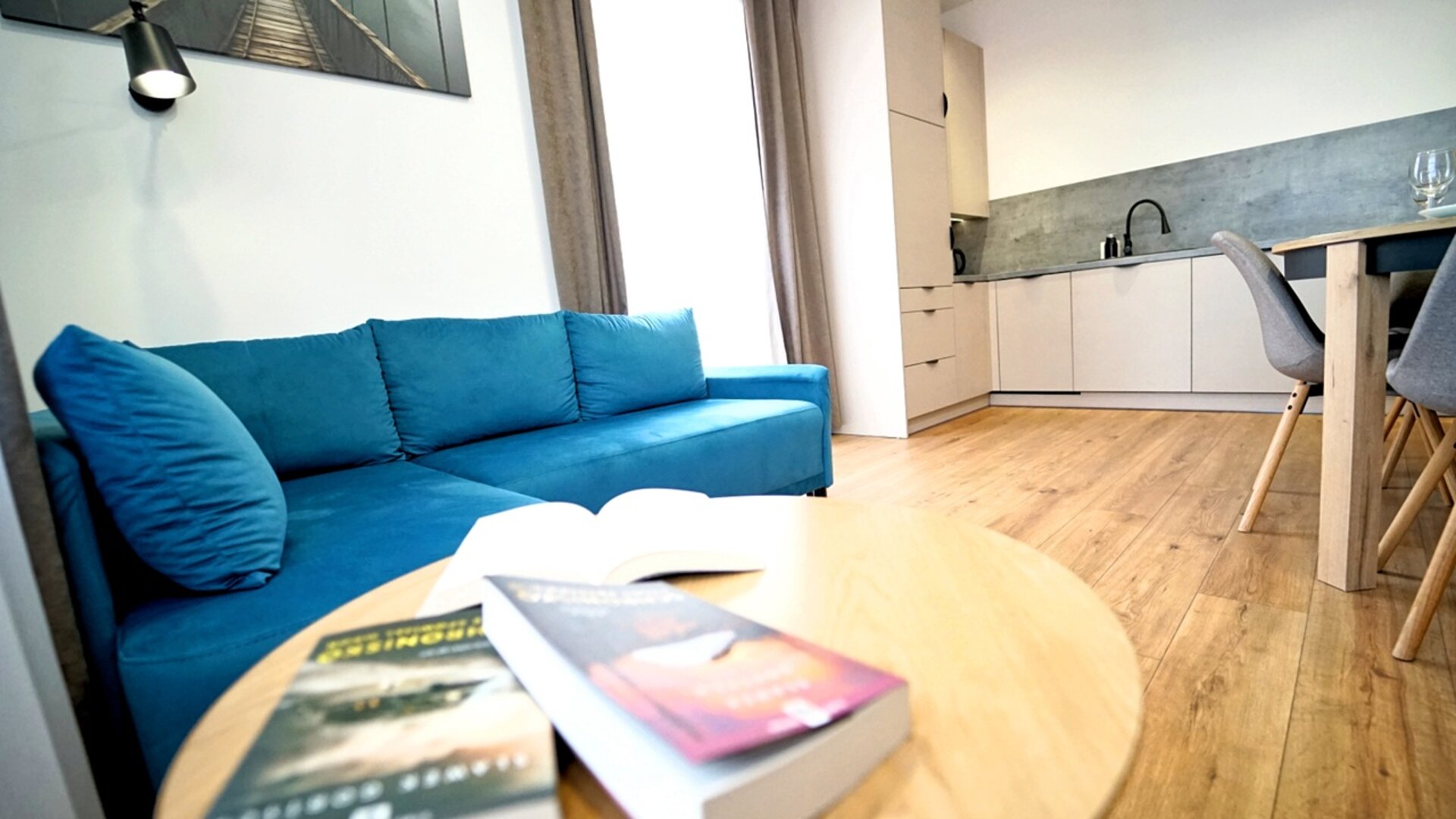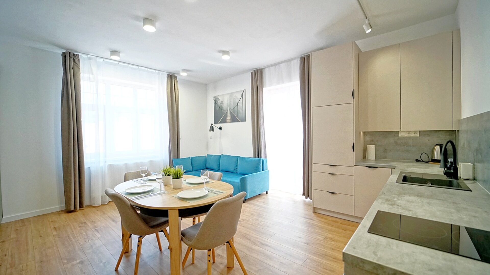 Do dyspozycji gości jest także nowoczesny aneks kuchenny wyposażony w zmywarkę oraz pełny zestaw naczyń i akcesoriów niezbędnych do przygotowywania posiłków. W apartamencie dostępna jest telewizja kablowa.