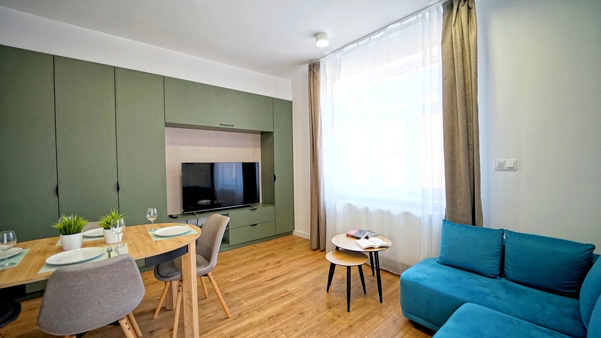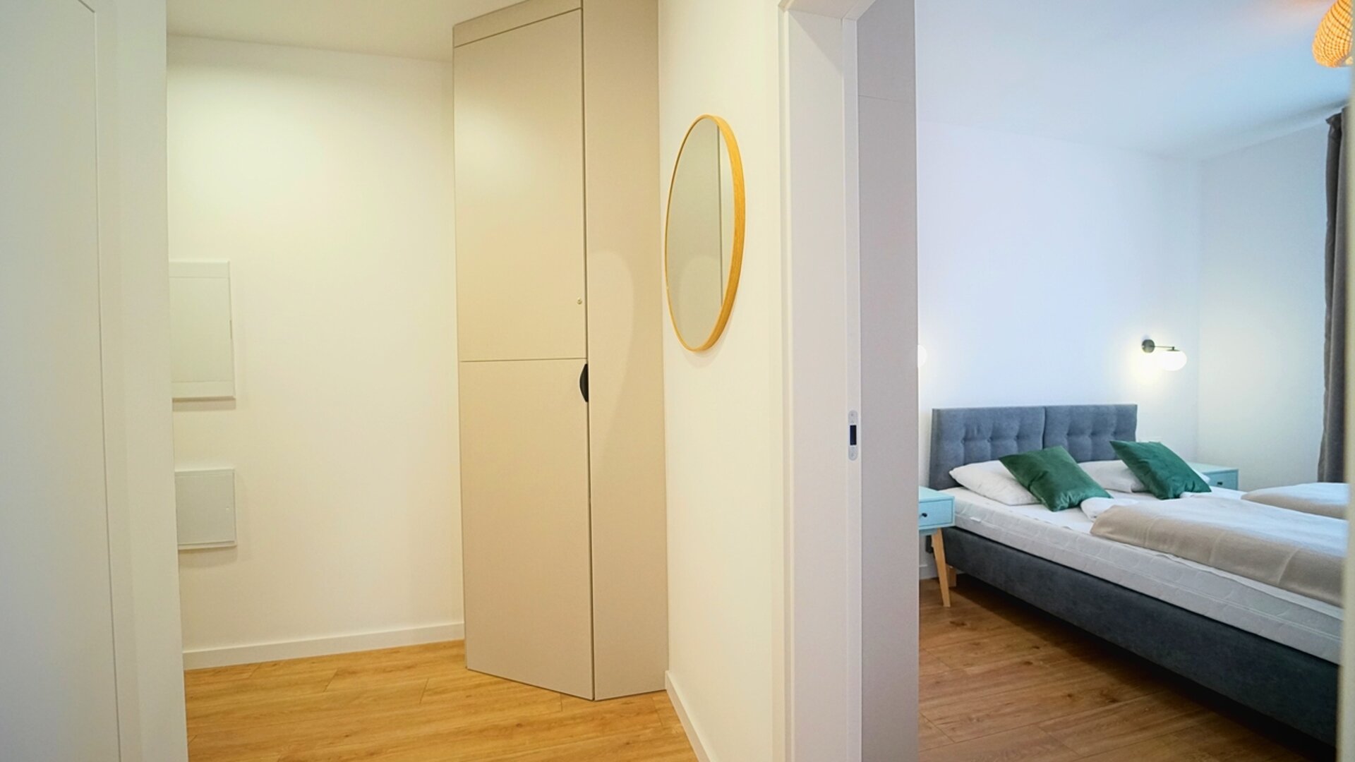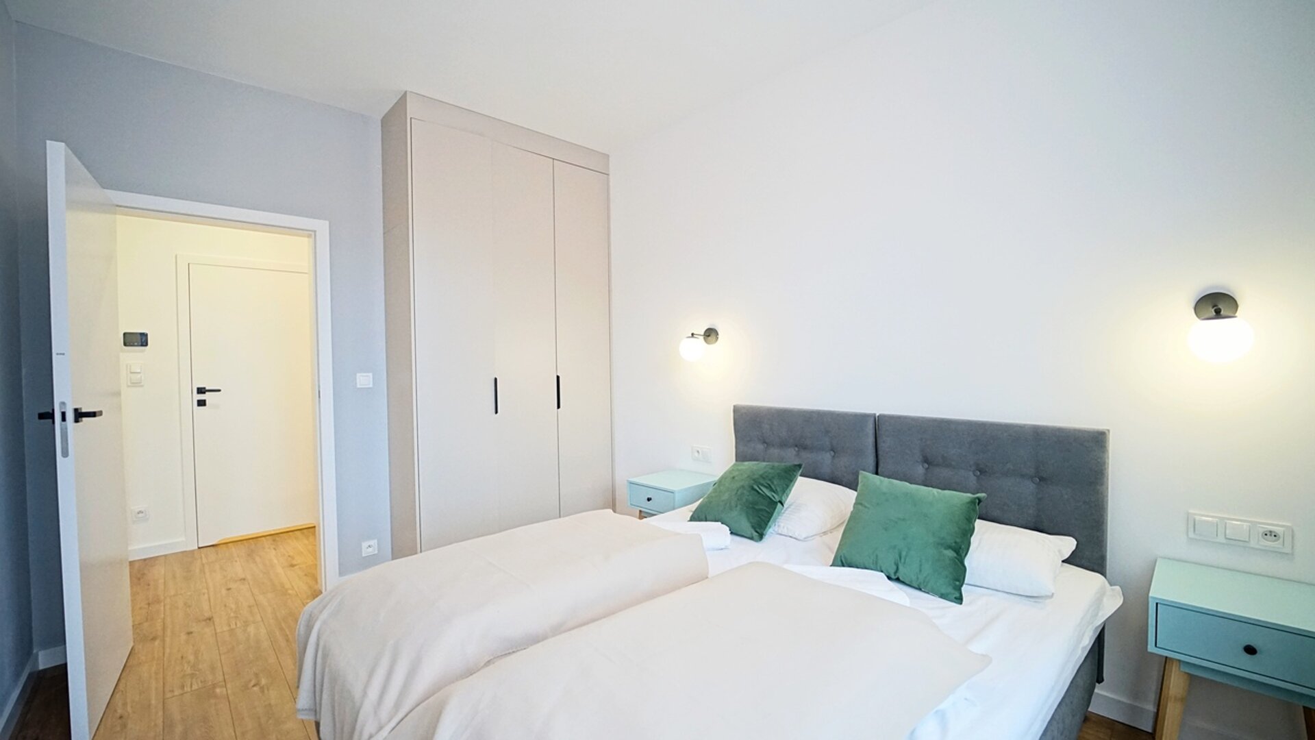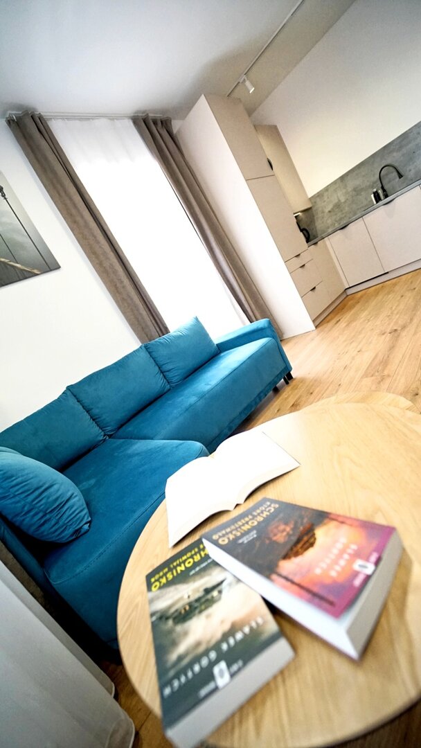 Do dyspozycji gości jest także nowoczesny aneks kuchenny wyposażony w zmywarkę oraz pełny zestaw naczyń i akcesoriów niezbędnych do przygotowywania posiłków. W apartamencie dostępna jest telewizja kablowa.