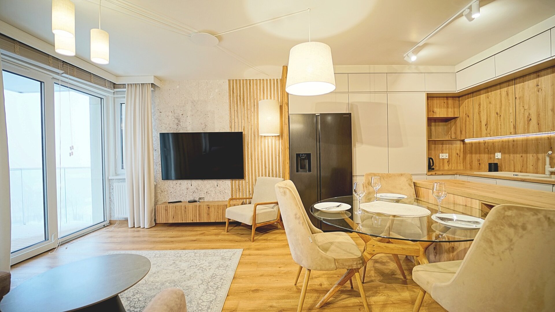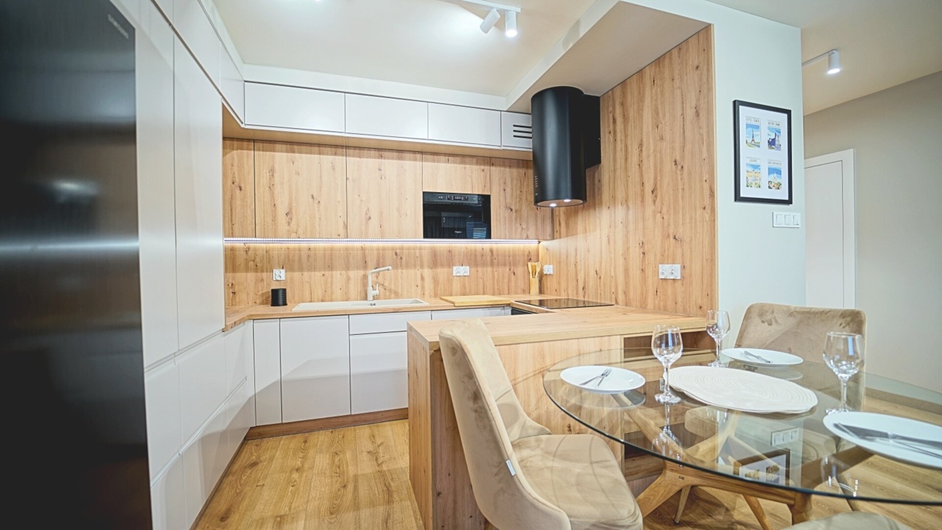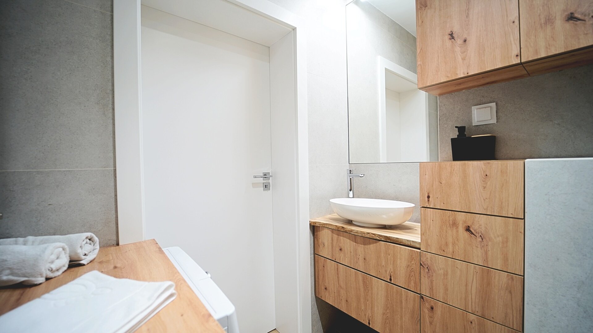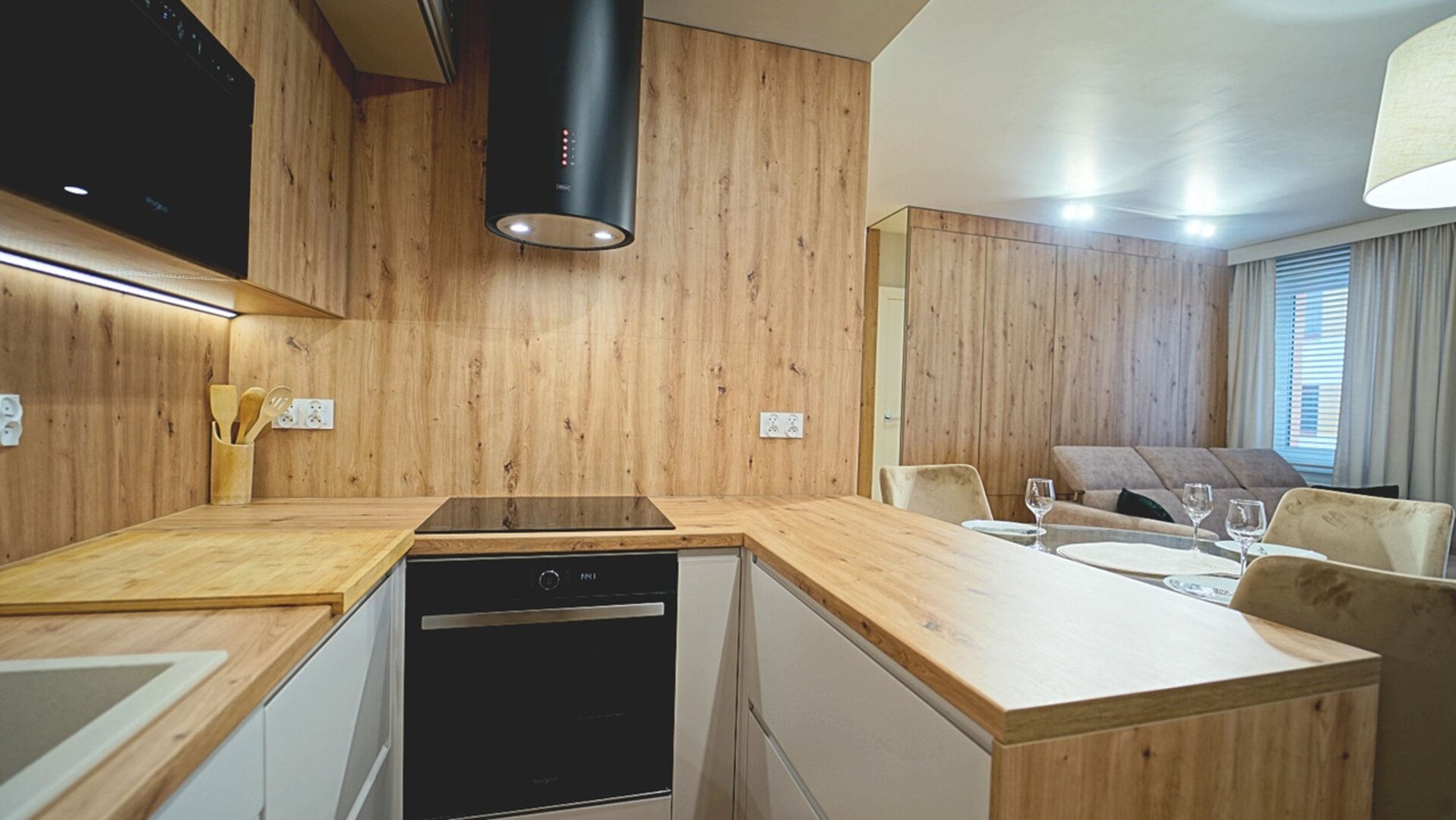 Aneks kuchenny jest w pełni wyposażony, co umożliwia przygotowywanie posiłków na miejscu. Znajdziesz tam nowoczesną lodówkę, płytę indukcyjną, kuchenkę mikrofalową, ekspres do kawy oraz czajnik elektryczny, piekarnik – wszystko, czego potrzeba do wygodnego pobytu. Do dyspozycji gości jest również stylowa łazienka z nowoczesną kabiną prysznicową, co zapewnia pełen komfort. Dodatkowym atutem jest pralka!