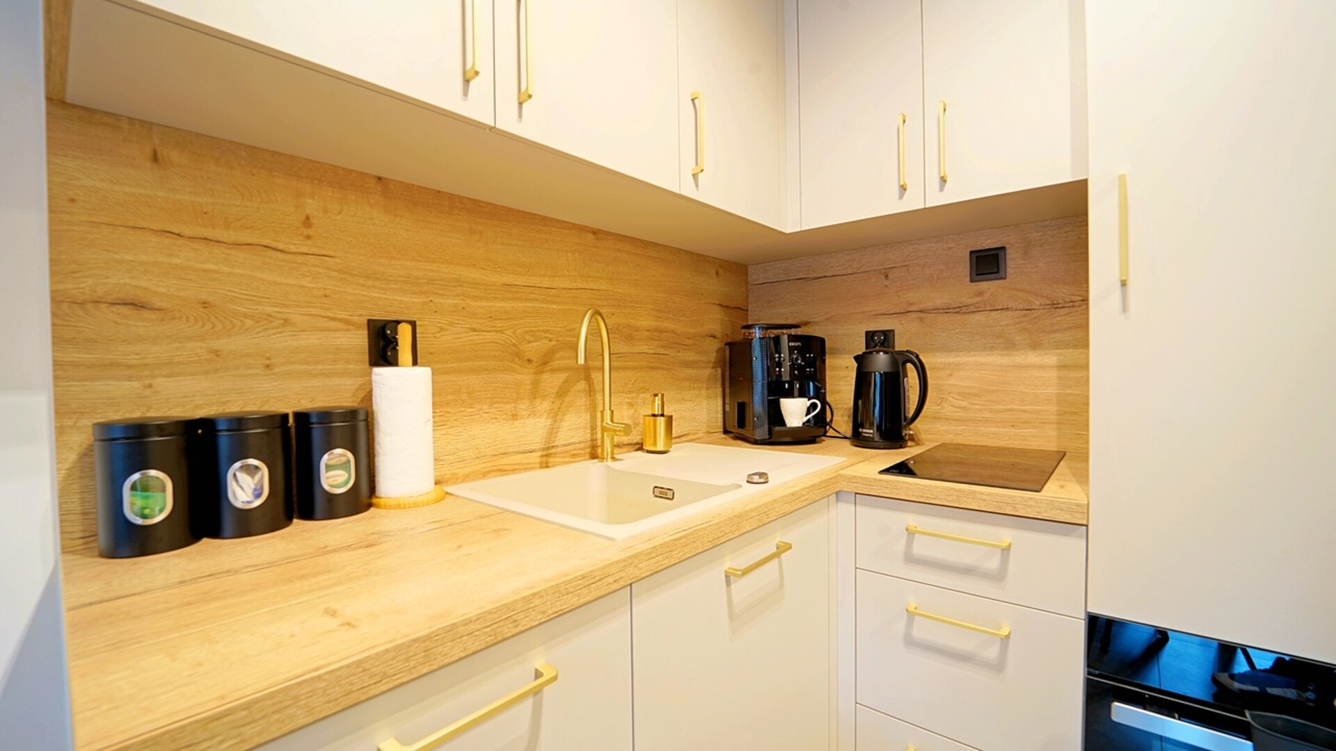 Lokal oferuje komfortowe udogodnienia, idealne dla osób szukających relaksu i wygody. Składa się z zamykanej sypialni z przestronnym, wygodnym łóżkiem małżeńskim, zapewniającym spokojny wypoczynek. W pełni wyposażony aneks kuchenny umożliwia przygotowywanie posiłków, a w jego skład wchodzą m.in. płyta indukcyjna, lodówka, zmywarka, czajnik, piekarnik, ekspres do kawy oraz naczynia i sztućce.